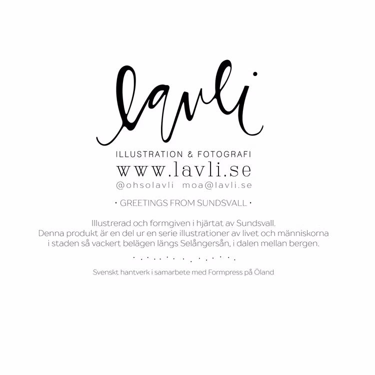 ”Illustrerad och formgiven i hjärtat av Sundsvall. Denna produkt är en del ur en serie illustrationer av livet och människorna i staden så vackert belägen längs Selångersån, i dalen mellan bergen.”