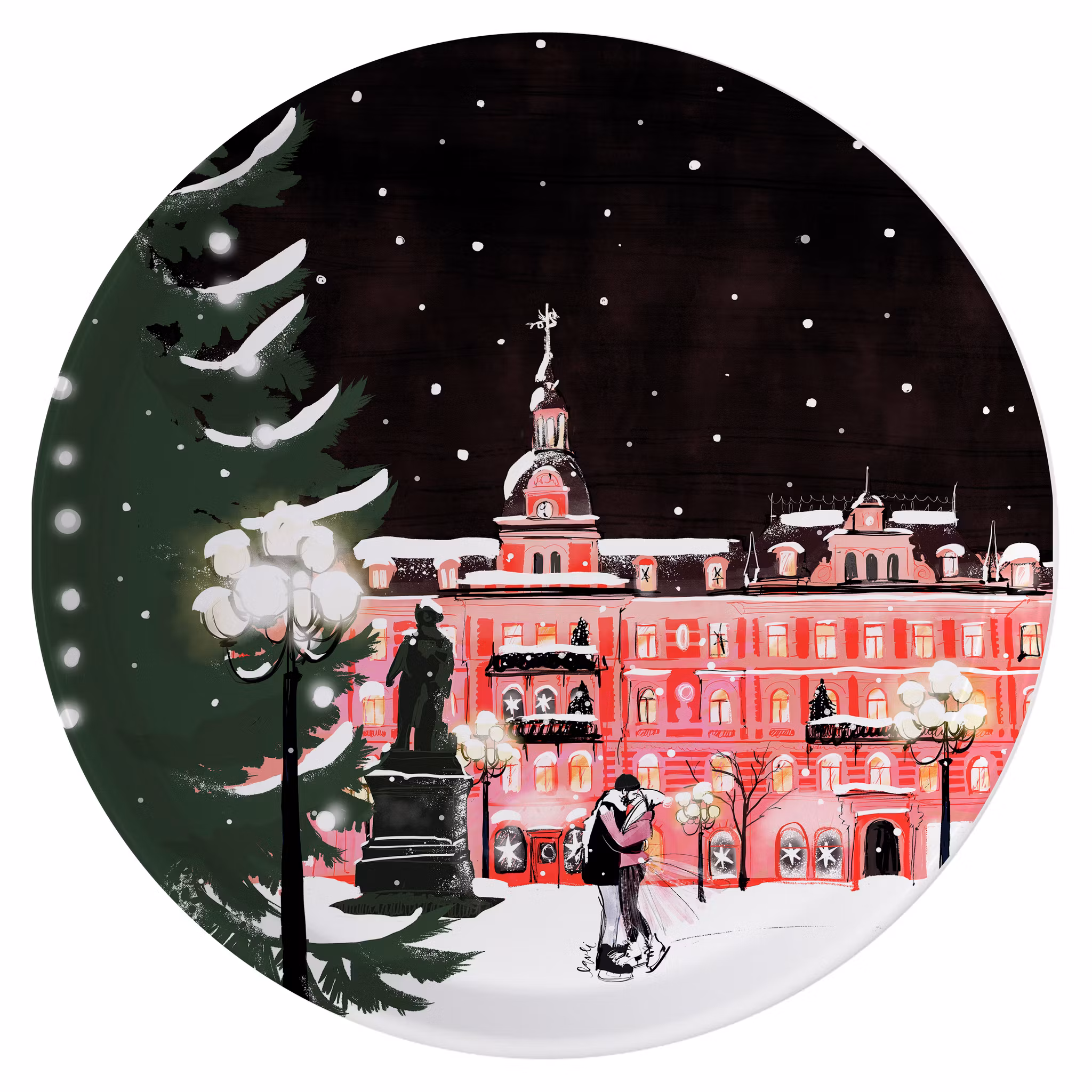 Rund, svensktillverkad bricka i tåligt och slitstarkt björklaminat med härligt motiv av ett vintrigt Sundsvall! Perfekt för de flesta fikastunder, men även väldigt dekorativ på en hylla eller i ett kök. 38cm i diameter.