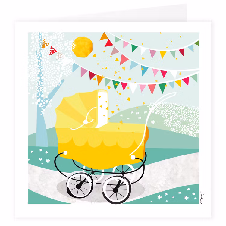 Dubbelvikt kort 148x148mm med illustrerat motiv med barnvagn och vimplar. Tryckt på kraftigt, fint och obestruket papper för en matt och snygg yta. Jag gör de flesta motiv utan text, för att du ska kunna använda dem till olika ändamål och för att det med glädje ska kunna sparas - de är jättefina att rama in! På så sätt får kortet ett långt och hållbart liv. :)