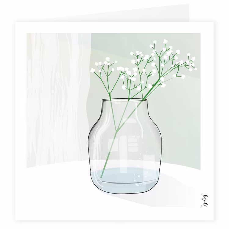 Dubbelvikt kort 148x148mm med illustrerat motiv med skir brudslöja i vas. Tryckt på kraftigt, fint och obestruket papper för en matt och snygg yta. Jag gör de flesta av mina motiv utan text, för att du ska kunna använda dem till olika ändamål och för att det med glädje ska kunna sparas - de är jättefina att rama in! På så sätt får kortet ett långt och hållbart liv. :)