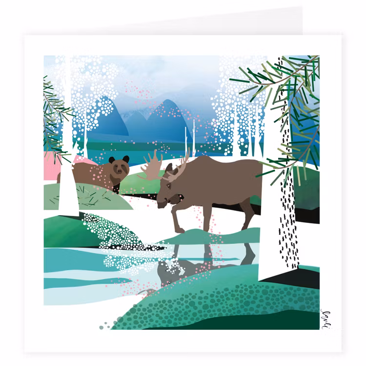 Dubbelvikt kort 148x148mm med illustrerat motiv med skog, älg, björn och fjäll. Tryckt på kraftigt, fint och obestruket papper för en matt och snygg yta. Jag gör de flesta av mina motiv utan text, för att du ska kunna använda dem till olika ändamål och för att det med glädje ska kunna sparas - de är jättefina att rama in! På så sätt får kortet ett långt och hållbart liv. :)