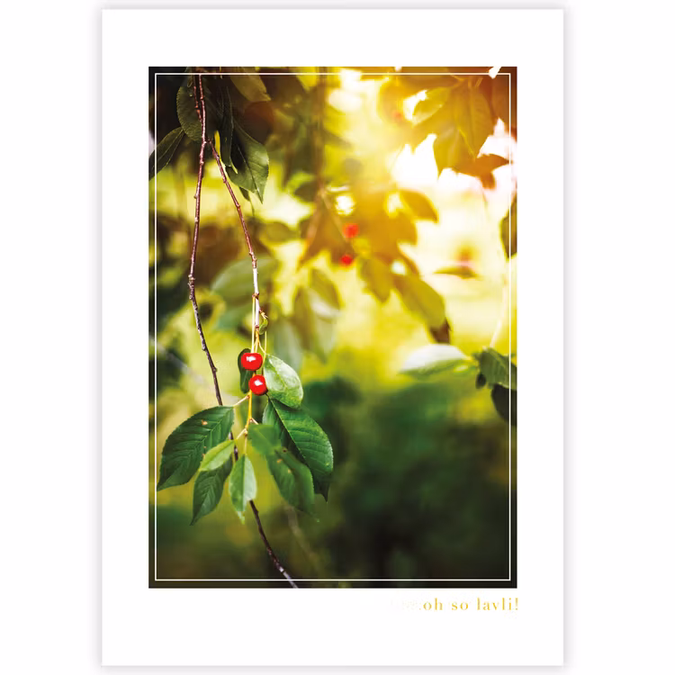 Fint fotokort med motiv av somriga körsbär. Digitaltryckt i Sundsvall på ett fint obestruket, kraftigt papper och det lyxiga konstkortet är fint att ge bort för att sedan kunna sparas eller ramas in, och får på så sätt ett långt liv!