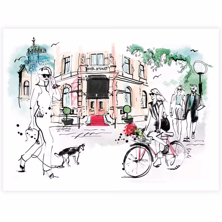 Fint A5 vykort med illustrerat motiv skapat med flytande tusch och akvarell av livet utanför historiskt betingade Hotel Knaust i Sundsvall.