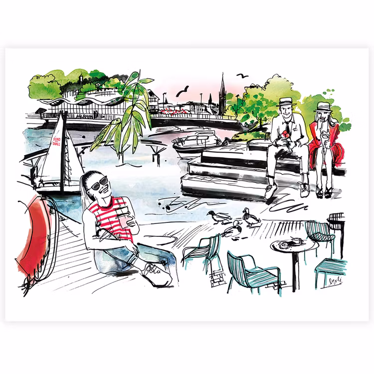 Fint A5 vykort med illustrerat motiv skapat med flytande tusch och akvarell av staden mellan bergen, så vackert belägen längs Selångersån.