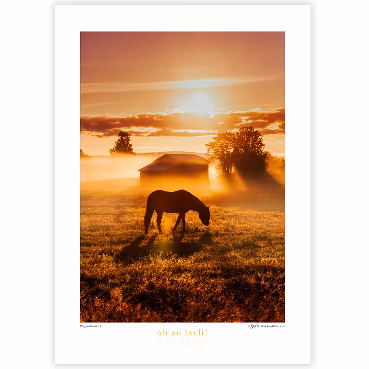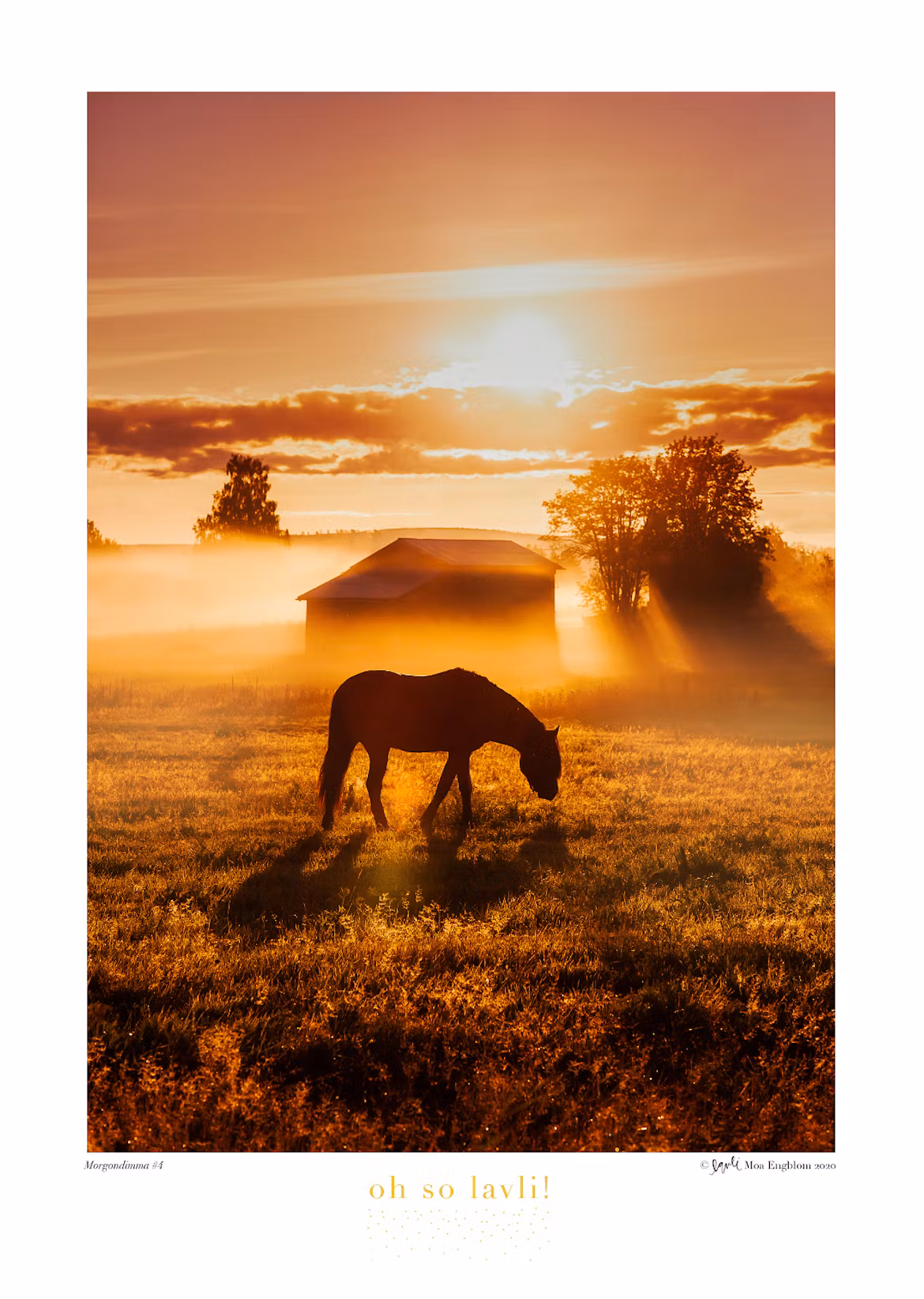 Eftersom jag är en kvällsmänniska väljer jag oftast solnedgång framför soluppgång, men just därför blir mina tidiga morgnar desto mer åtråvärda. När jag väl möter soluppgången under sommaren finns knappt nåt mer magiskt. Morgondaggen gör att varenda liten spindelväv glittrar, morgondimman ligger ofta tät samtidigt som solen stiger upp bakom trädtopparna och solstrålarna bryter igenom älvdansen. På landet där jag är uppvuxen är hästarna morgonpigga och sällskapssjuka på morgonen, så det finns alltid sällskap. Och deras varma mular i kontrast till den lite råa luften är allt som behövs för att ställa klockan på väckning morgonen därpå igen..