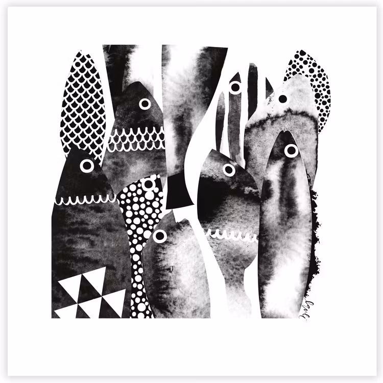 Konstmotiv i akvarell och grafiskt effektfulla inslag i detta motiv av svartvita fiskar. Fin på vilken vägg som helst, men givetvis så snygg i ett kök!