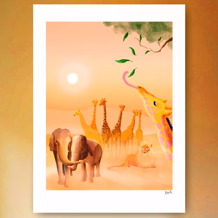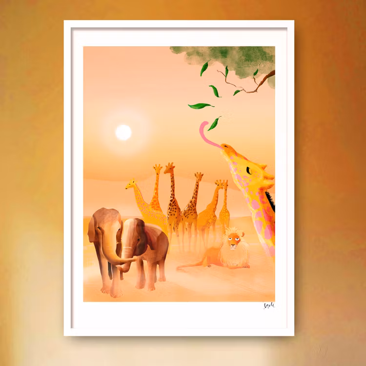 Nytt lekfullt motiv med inspiration från savannens disiga värme, färggrannt och enkelt på samma gång. Bara himlen, solen, djuren och den varma känslan. Lika fint i barnrummet som i resten av hemmet!