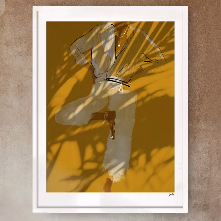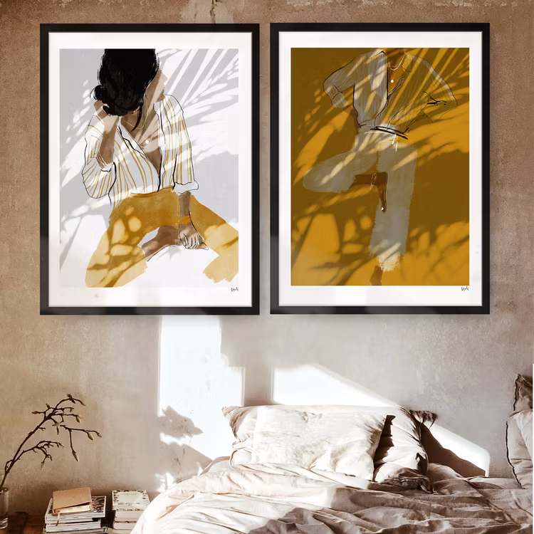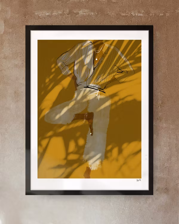 Vilsamt, måleriskt motiv i ockragult och naturtoner. Så fint både i ett färgstarkt och mer avskalat rum. Fint att kombinera med Sunseeker #1.