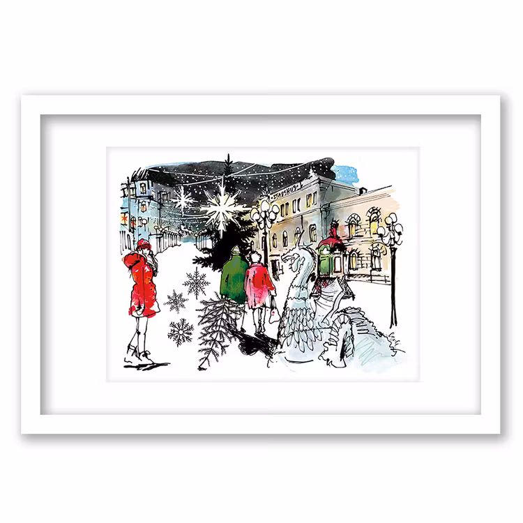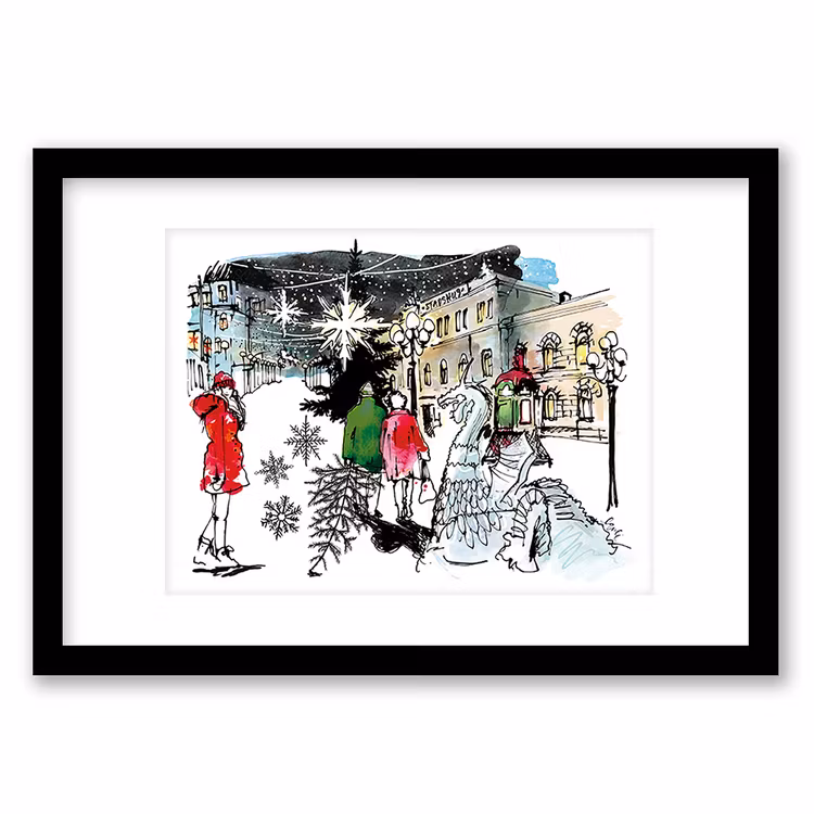 Illustrerat motiv skapat med flytande tusch och akvarell av livet på Stora Torget i Sundsvall i vacker vintertid.